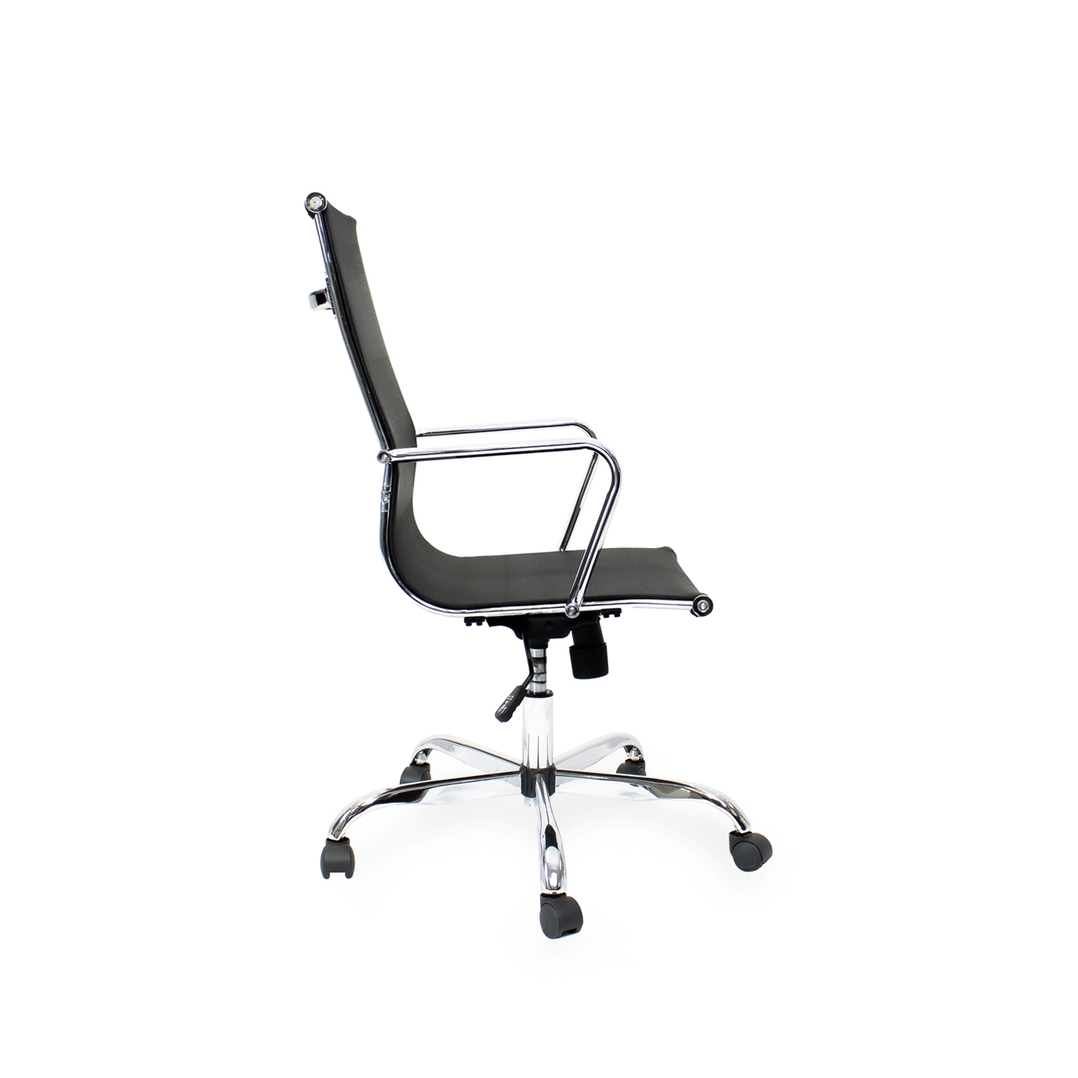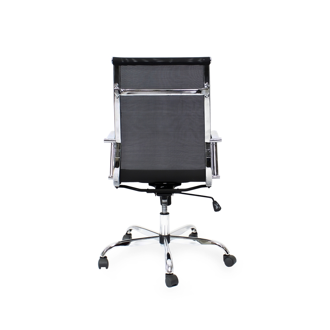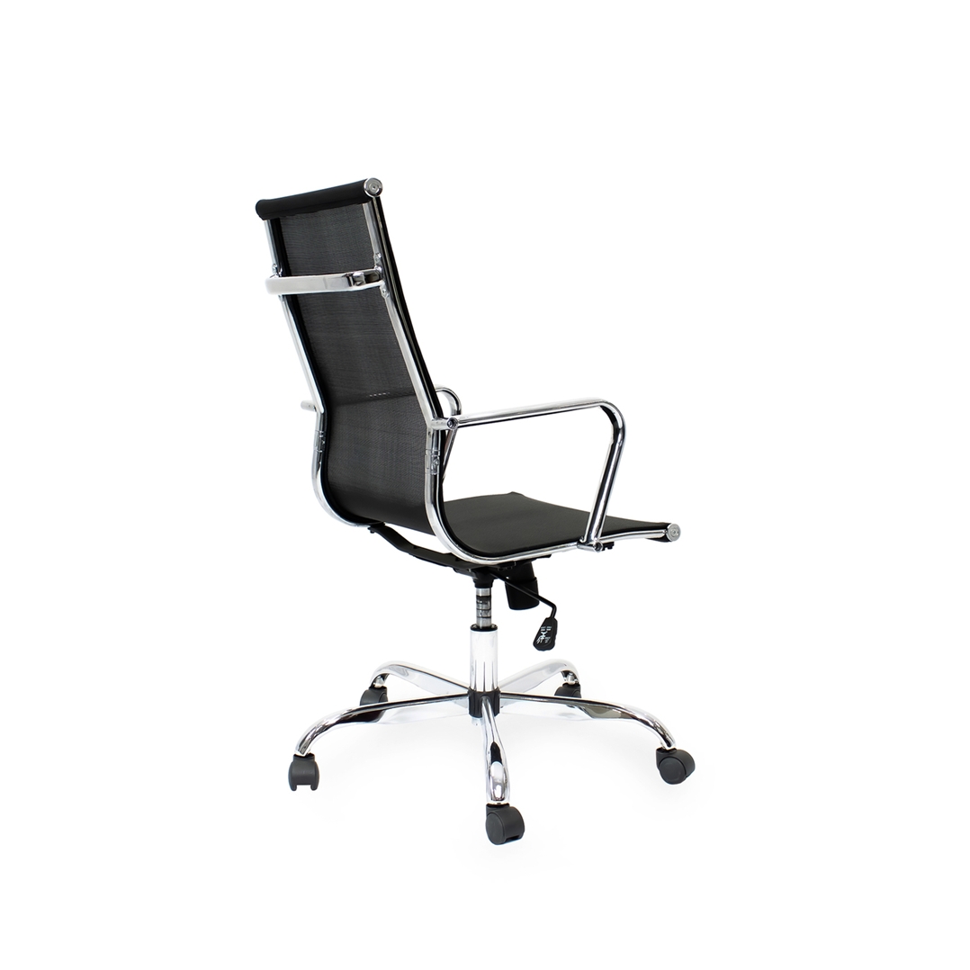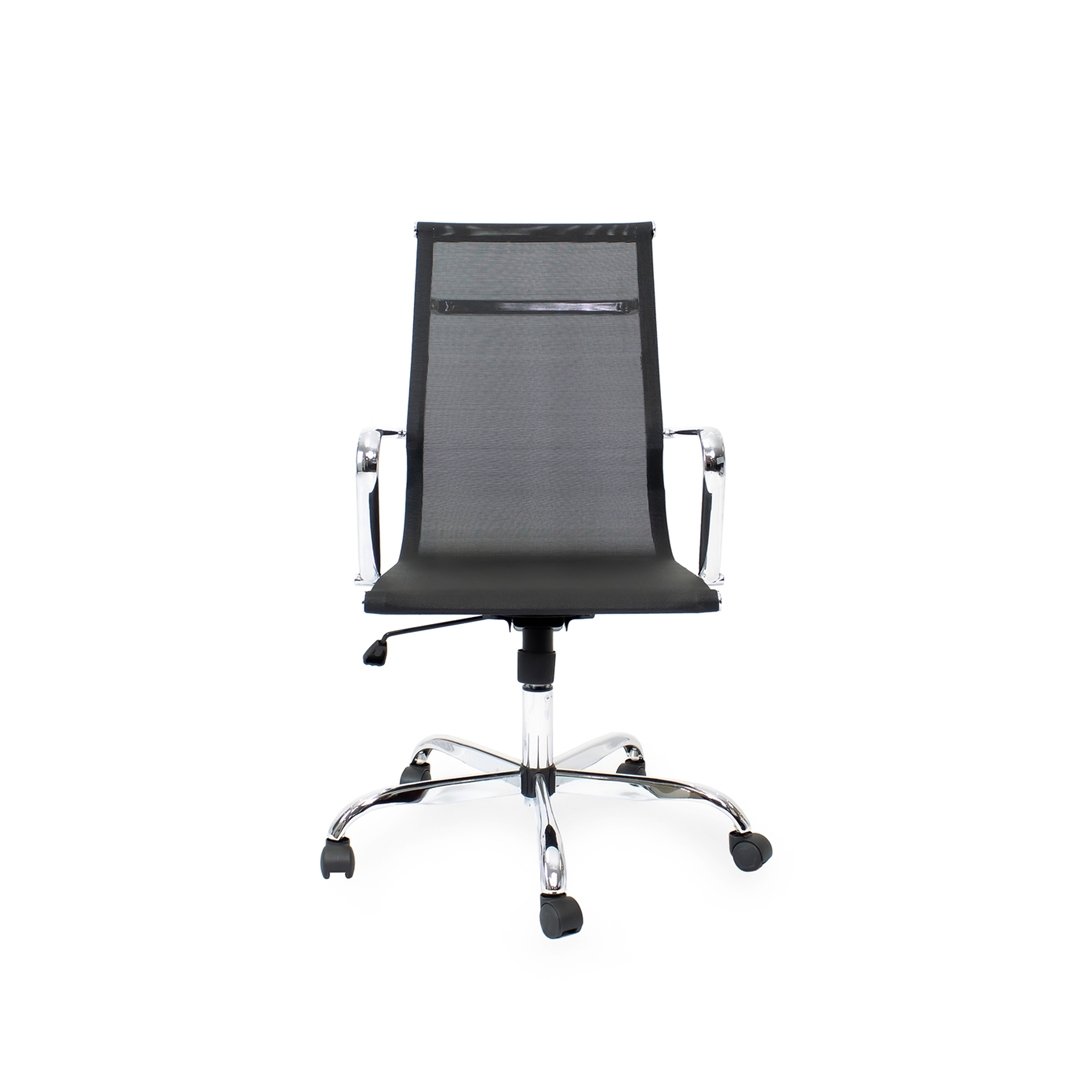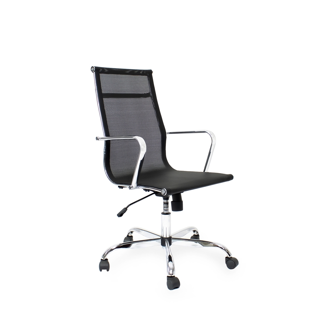 High back operators chairs with full mesh back and seat on chrome base. Fixed Chrome arms on swivel and tilt mechanism.