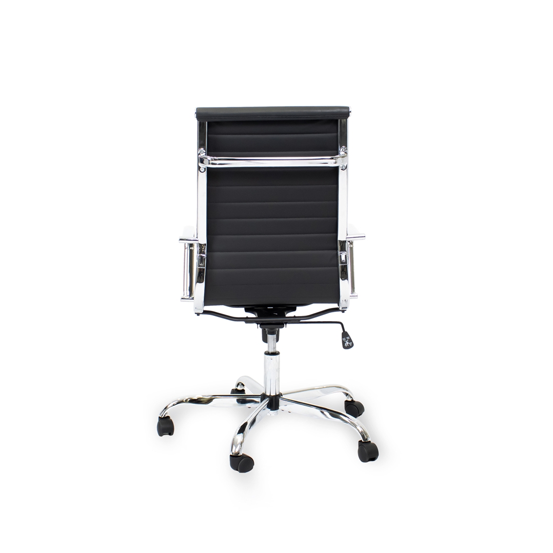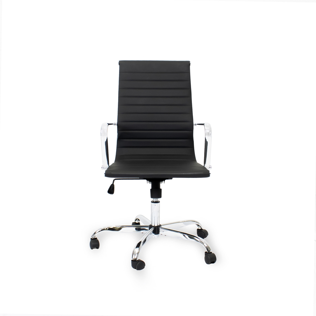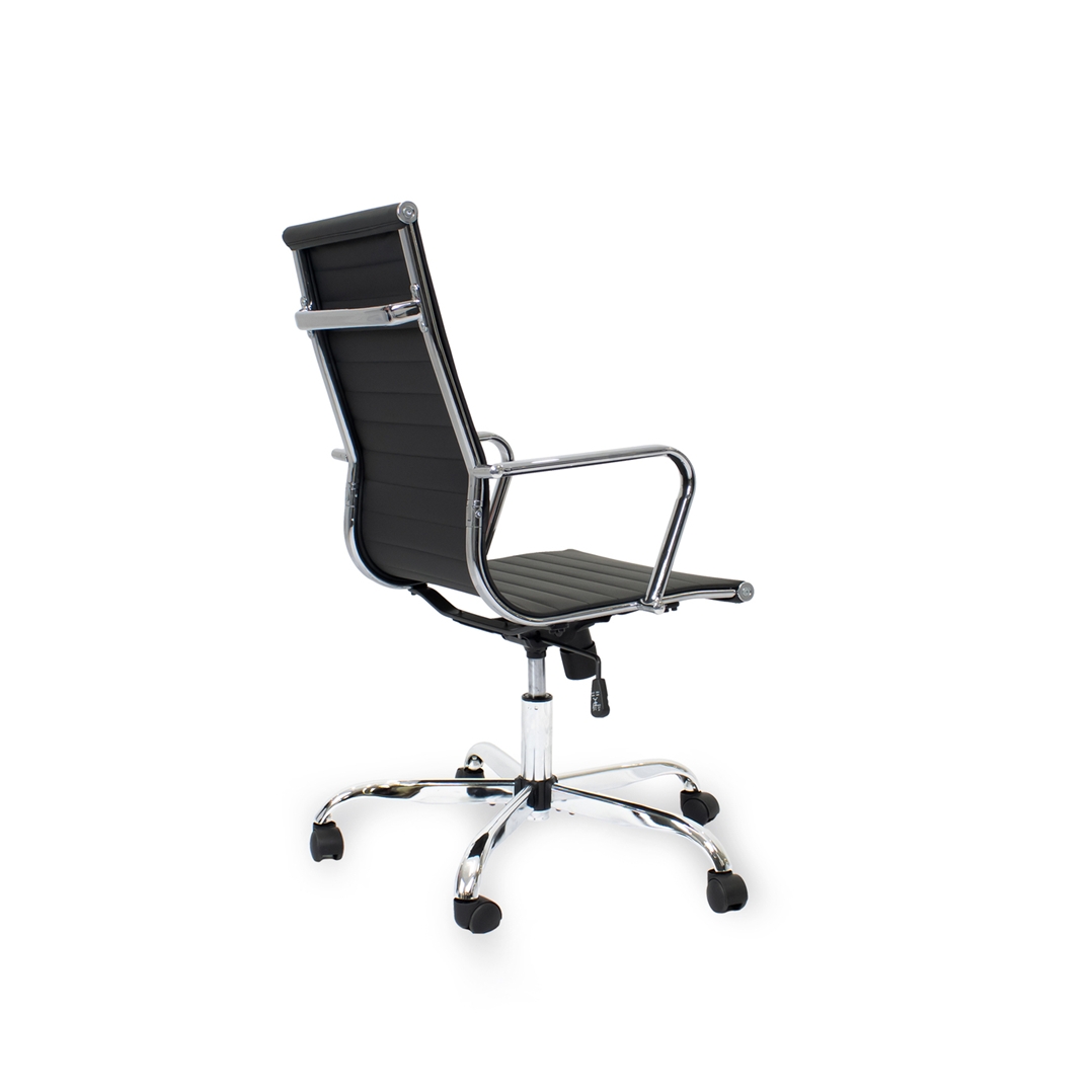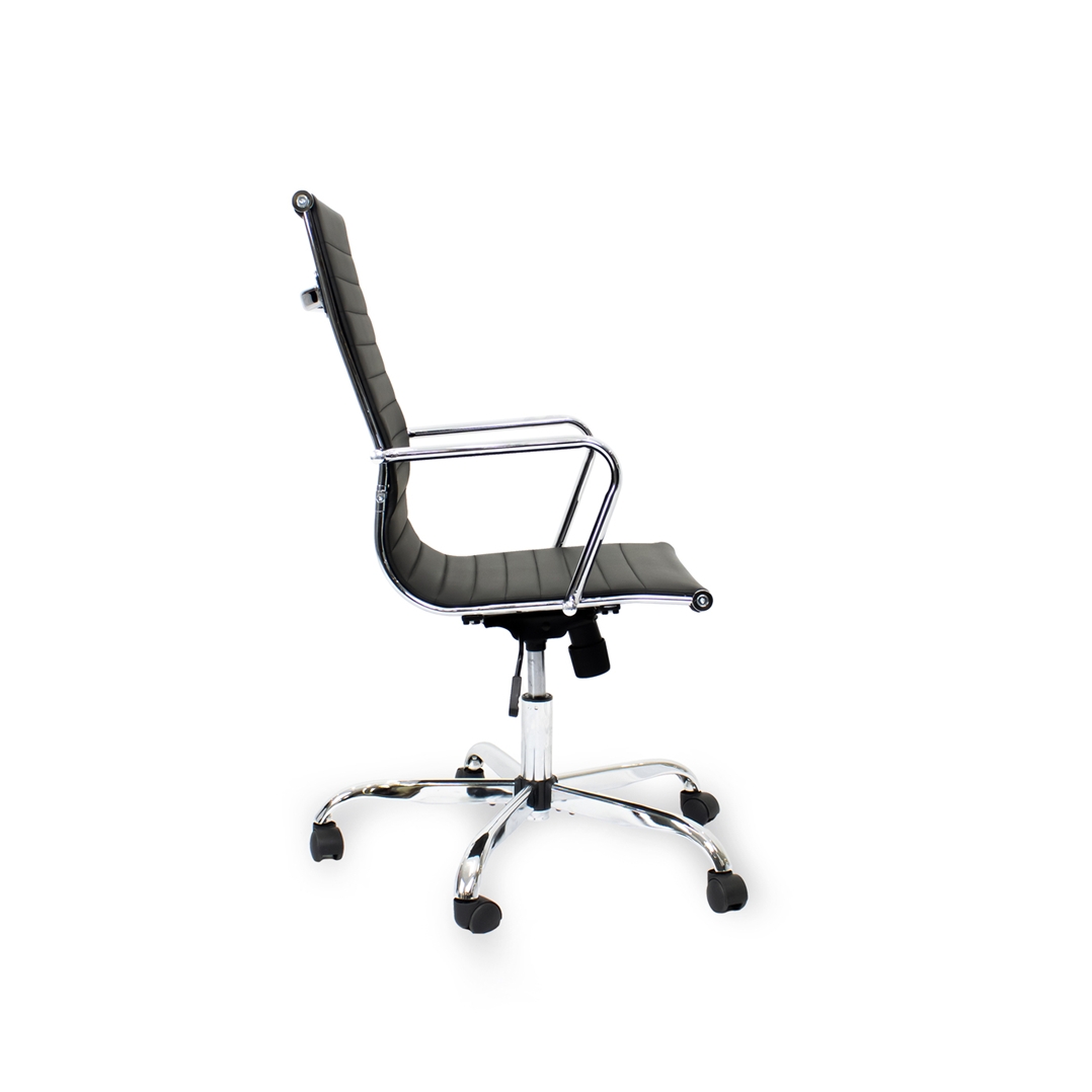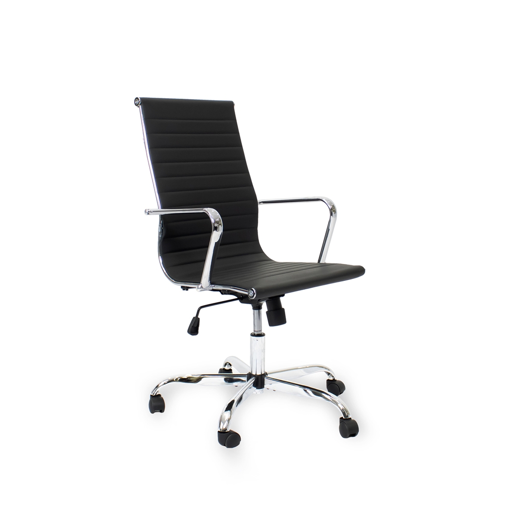 High back operators chairs with full PU back and seat on chrome base Fixed chrome arms on swivel and tilt mechanism.