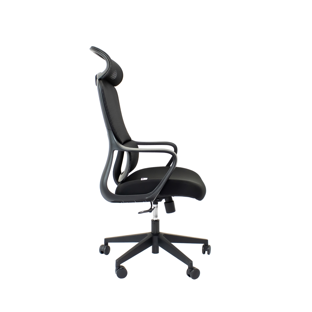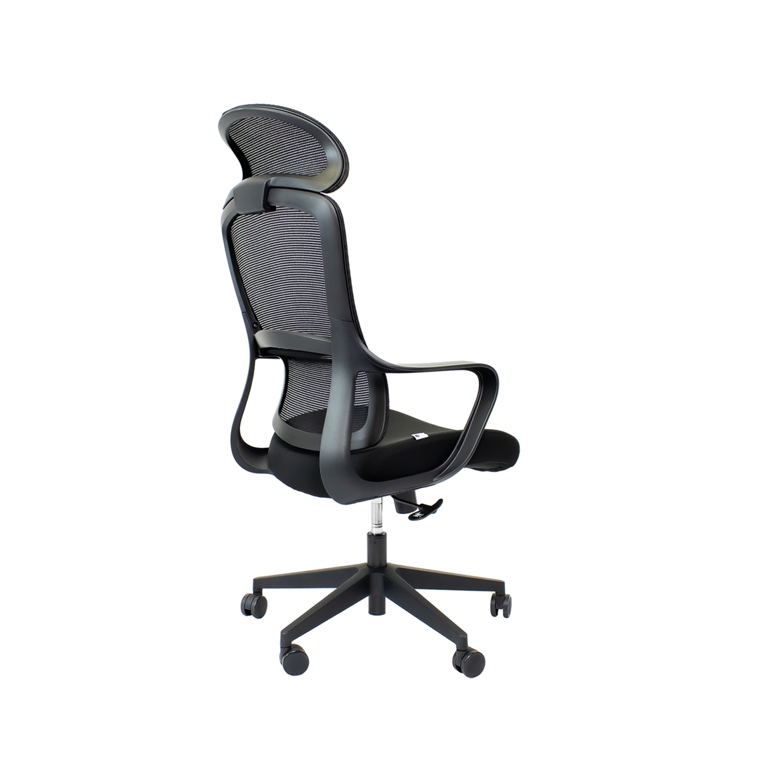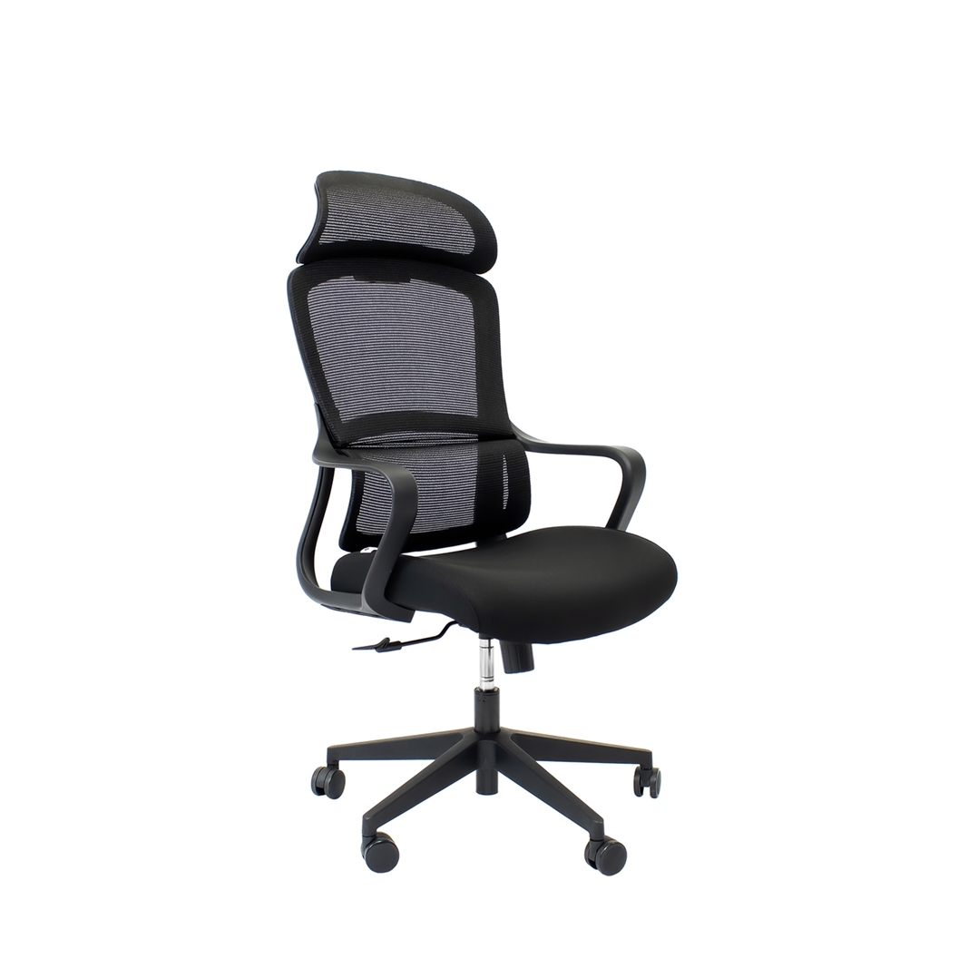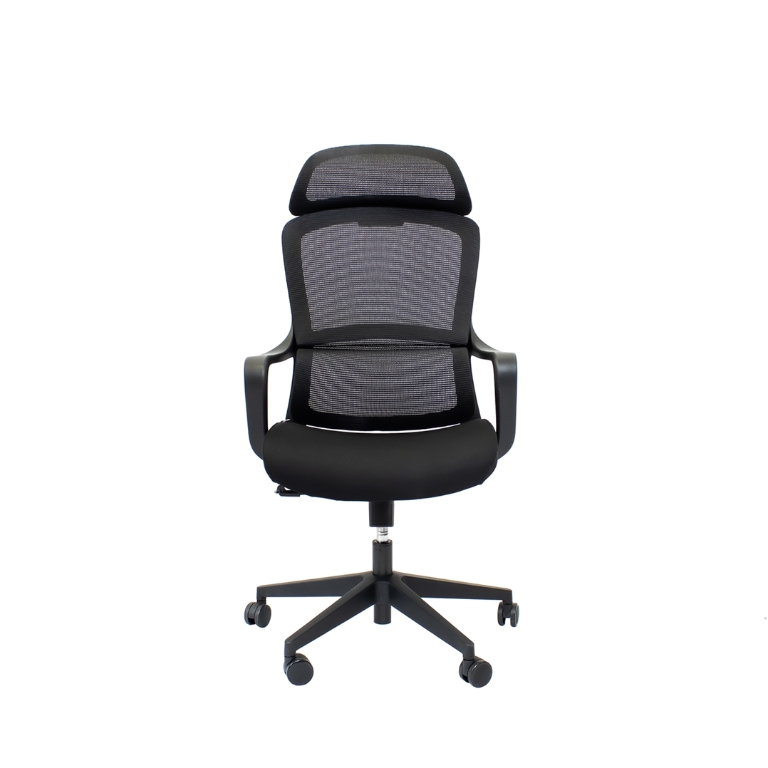 Black mesh High Back operators chair including headrest. Black 5* Nylon Base. Moulded Foam Seat. Econo Synchro Mechanism 1 position, tension adjustable lock. Fixed armrest and lambar support.